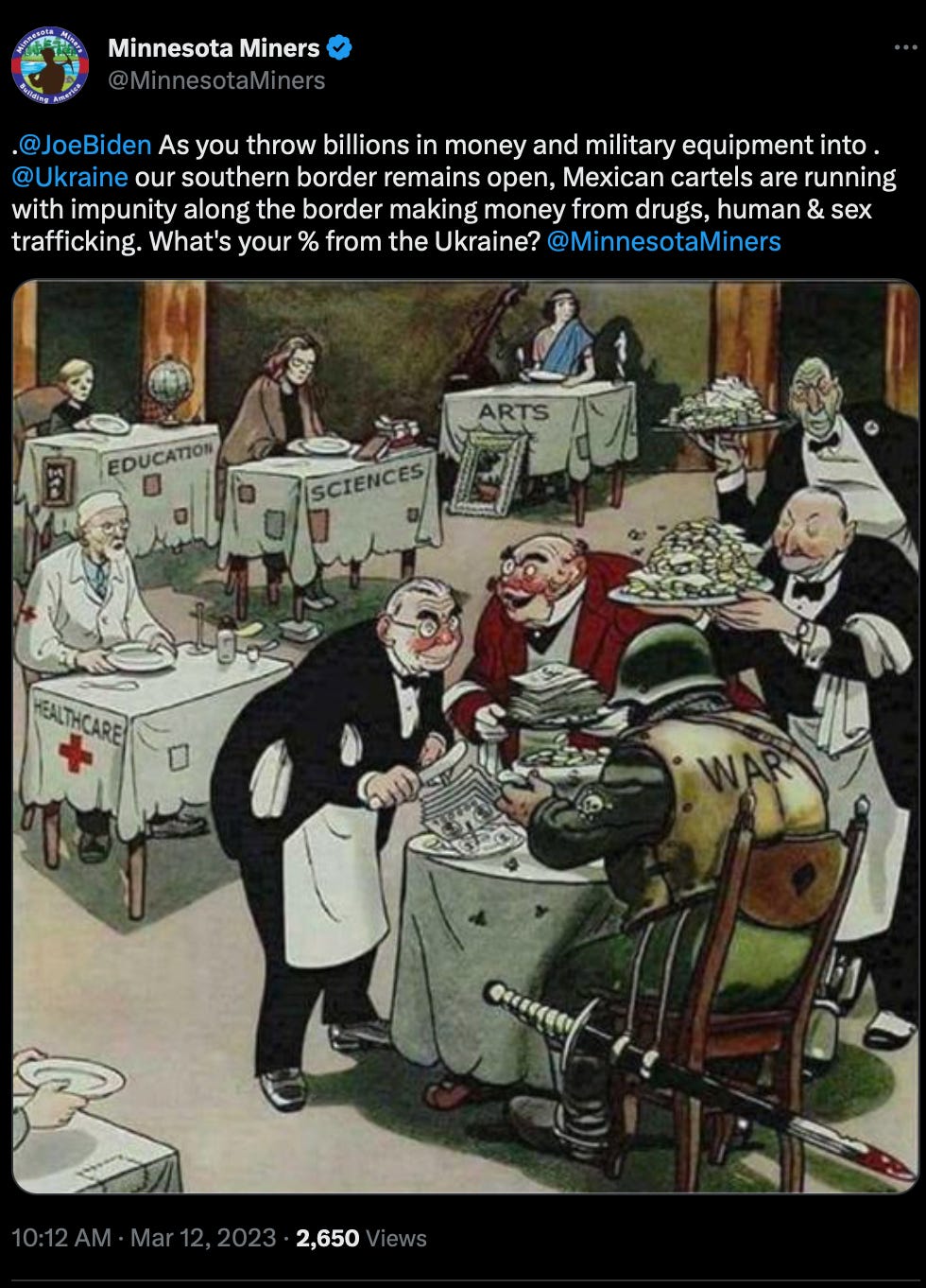 All of the 'wars' are contrived and consequently are huge wealth distribution and depopulation mechanisms. The R/U war was planned years ago as a strategy to deplete US resources, cause mass migration, deaths and chaos in the region. These are all requirements of the WEF and its NWO. With Biden at the helm the WEF never had it so good. It's a sorry situation that it is the US fomenting wars around the globe since the 2000s. And Congress is habitually acting like the DOD is on the brink of being penniless even as it has no idea where millions of its funds go.