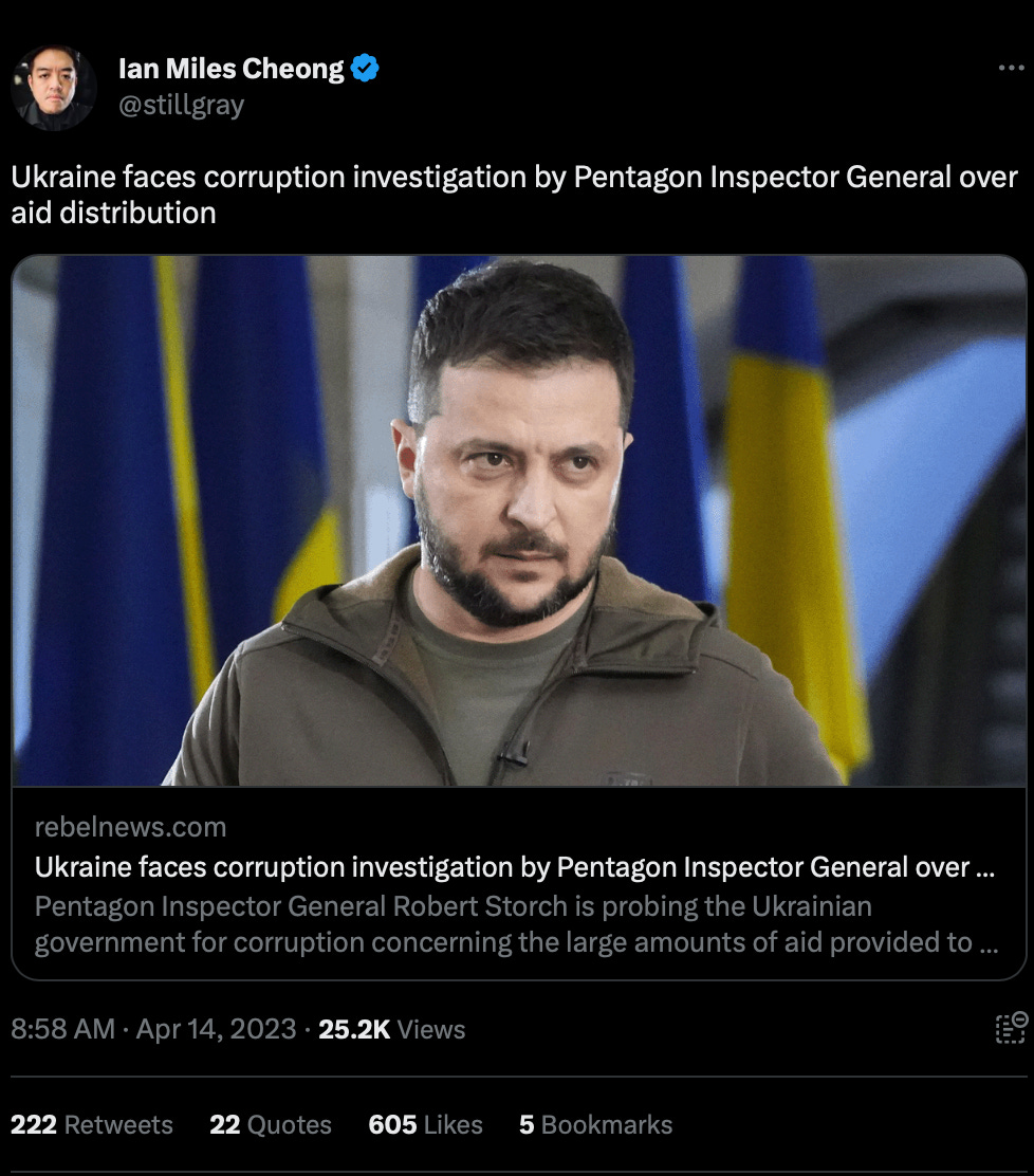 Seymour Hersh is reporting that the Ukrainians have embezzled at least $400 million of the money given them by the United States. Zelensky was confronted with the evidence of the embezzlement by CIA Director Burns and reportedly responded by dismissing a handful of officials but taking no serious action.