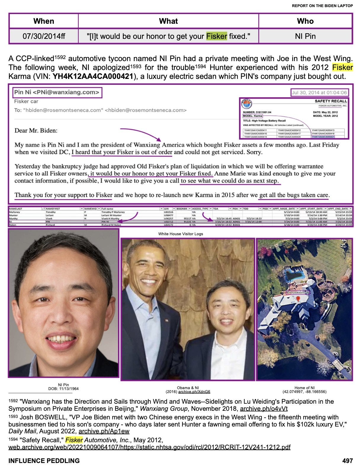Hunter was also linked to Ni via business investments made by his company, Seneca Global Advisors, and his personal investment in the Fisker automotive company. Four days after Ni met with Joe Biden, he sent an email to Hunter regarding the Fisker sports car Hunter had purchased.