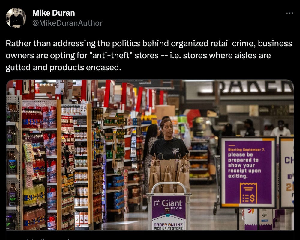 Downtown areas across the country are becoming ghost towns as retailers flee from heavily targeted areas. Impoverished areas in our inner cities are becoming food “deserts” as grocery stores close and move away. Giant Foods in the Anacostia area of Washington, D.C. recently announced a last-ditch measure. It will stop stocking name brands and only sell generics and store brands in the hope that this will stop organized gangs from continuing to loot the store. If this does not work the store will be forced to close and the residents of the area will be left without anywhere to shop.