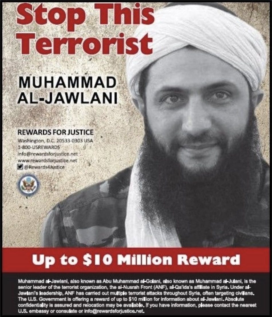 Ahmed Al-Sharaa aka Abu Muhammed Al-Jolani is the de facto leader of Syria. He is a dedicated jihadist who was sent to Syria by Al-Qaeda to overthrow the Assad government. He has a $10 million bounty on his head placed there by the U.S. Government.