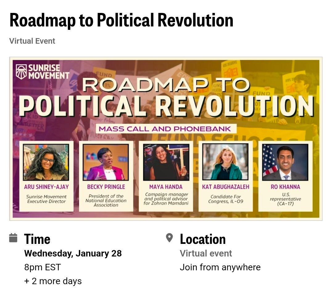 In January and February 2026, National Education Association (NEA) President Becky Pringle participated in a virtual event series hosted by the Sunrise Movement titled "Roadmap to Political Revolution." The event description read: “It’s time we dream — and organize — at the scale that Trump and billionaires are creating nightmares. 2026 is the year we break it all open…We need mass disruption to stop authoritarian consolidation.”