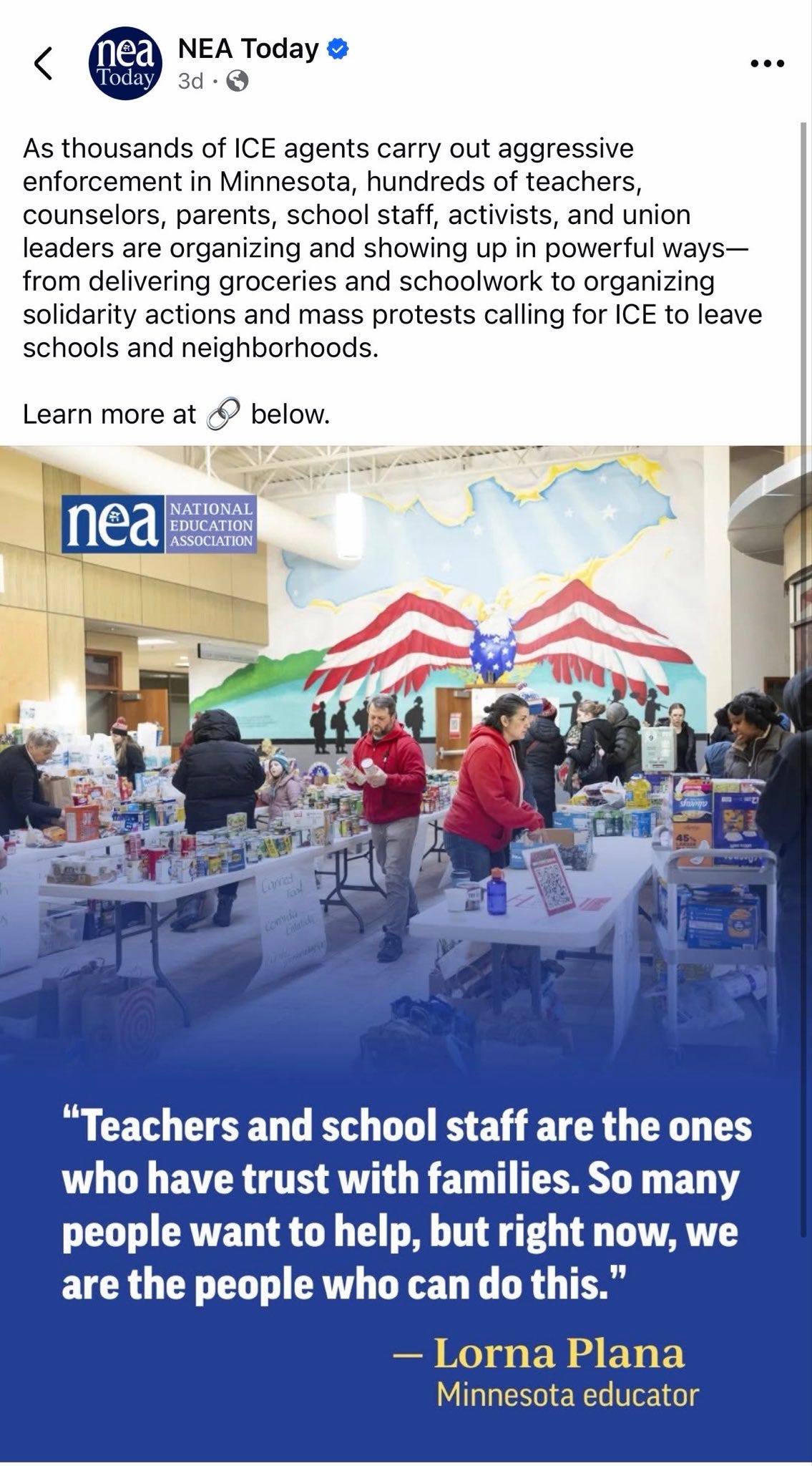 In the earlier years - 1982 - of my teaching career, I attended the NEA annual convention as an alternate delegate. (Ironically it was in Minneapolis.) The day I spent on the floor in place of a delegate who couldn't be there, I heard, for 3 hrs., the various state delegates debating the language to be used in a letter of reprimand from the NEA to then newly elected Pres. Reagan about his having funded the Contras in Nicaragua against the communist Sandinistas in the country's attempt to rid itself of communists. I've been retired now for 15 years. Over the past few days this past week, I witnessed two different classes - both from different local middle-schools - being led by teachers protesting against ICE and President Trump's deportation of illegals. (If I was the county prosecutor, I would have sheriff arrest the teachers, and prosecute them.)