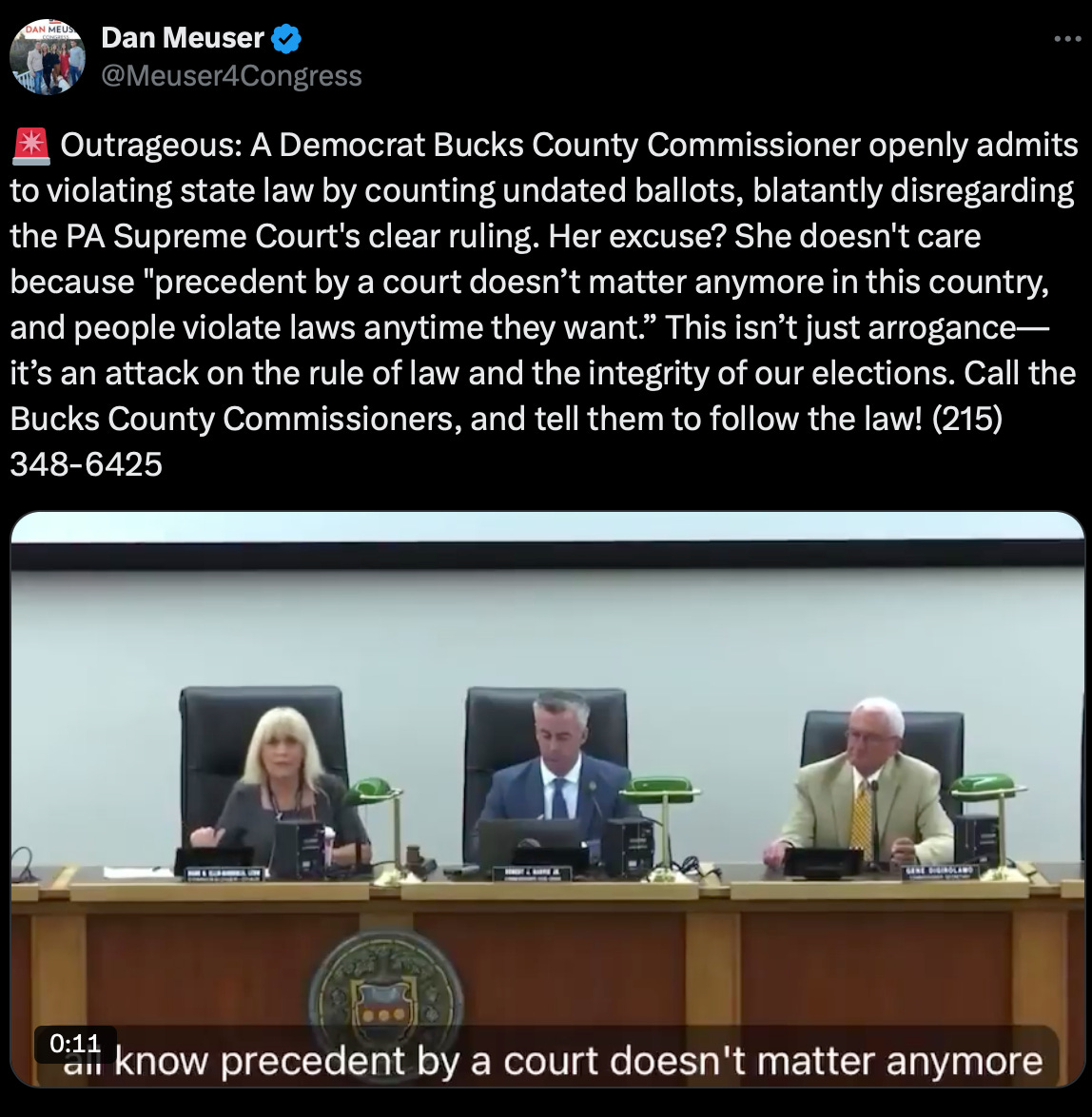 Over the last week, three separate Pennsylvania counties, Bucks, Centre, and Montgomery plus the city of Philadelphia began to count illegal ballots and add them to Casey’s total. Nobody disputes that the ballots were initially not counted because of legal defects. At least one Bucks County official admitted on video that they knew the ballots were illegal and that they were going to count them anyway. The news coverage of these actions has portrayed them as the work of hyper-partisan rogue Democratic officials acting out of anger over Trump’s win.