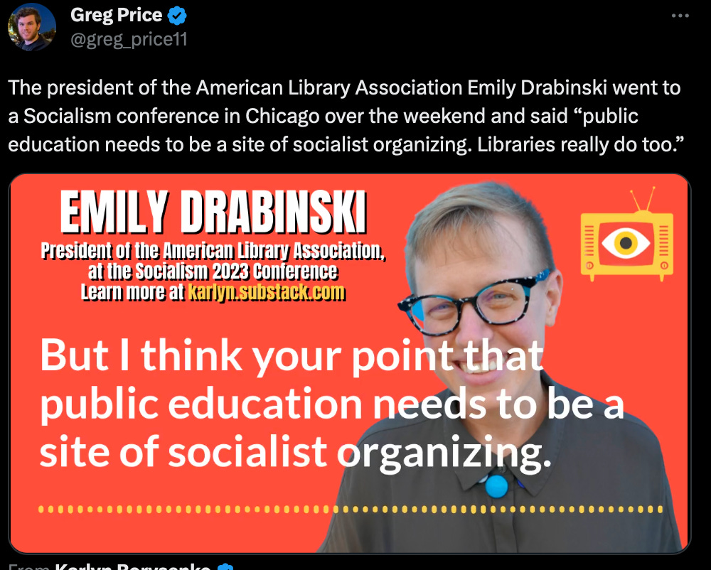 You don’t have to take my word for it. Listen to Ms. Drabinski, who runs the American Library Association describe her vision. Speaking at a Socialism conference in Chicago earlier this month, Drabinksi said “Public education needs to be the site of socialist organizing. Libraries really do too.”