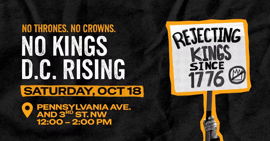 It will put millions in the street, calling not so much for a resolution of the immediate issue as for revolution. On October 18, 2025, “No Kings” protests will take place across the country. The largest is anticipated to be in Washington, DC, where crowds will gather on the Mall to “fight fascism”.