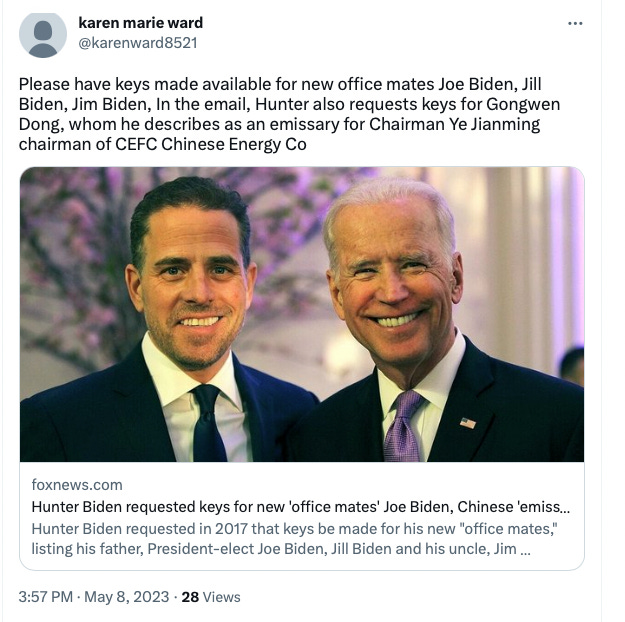 CEFC began its efforts to establish a relationship with the Bidens in 2015 when Joe was Vice-President. Once that relationship was established CEFC, Ye, and CEFC’s man in the United States, Gongwen “Kevin” Dong then funneled money to the Bidens through a vast array of shell companies designed to hide the payments.