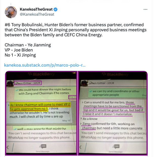 The connections between the Bidens and CEFC were broad and intensive. Hunter Biden told his then-partner Tony Bobulinski in text messages dated October 14, 2017, that he spoke with Ye on a “regular basis” and that they had a once-a-week call. Biden also became Ye’s personal counsel in the U.S. — essentially an employee and representative for the CEFC in the U.S.