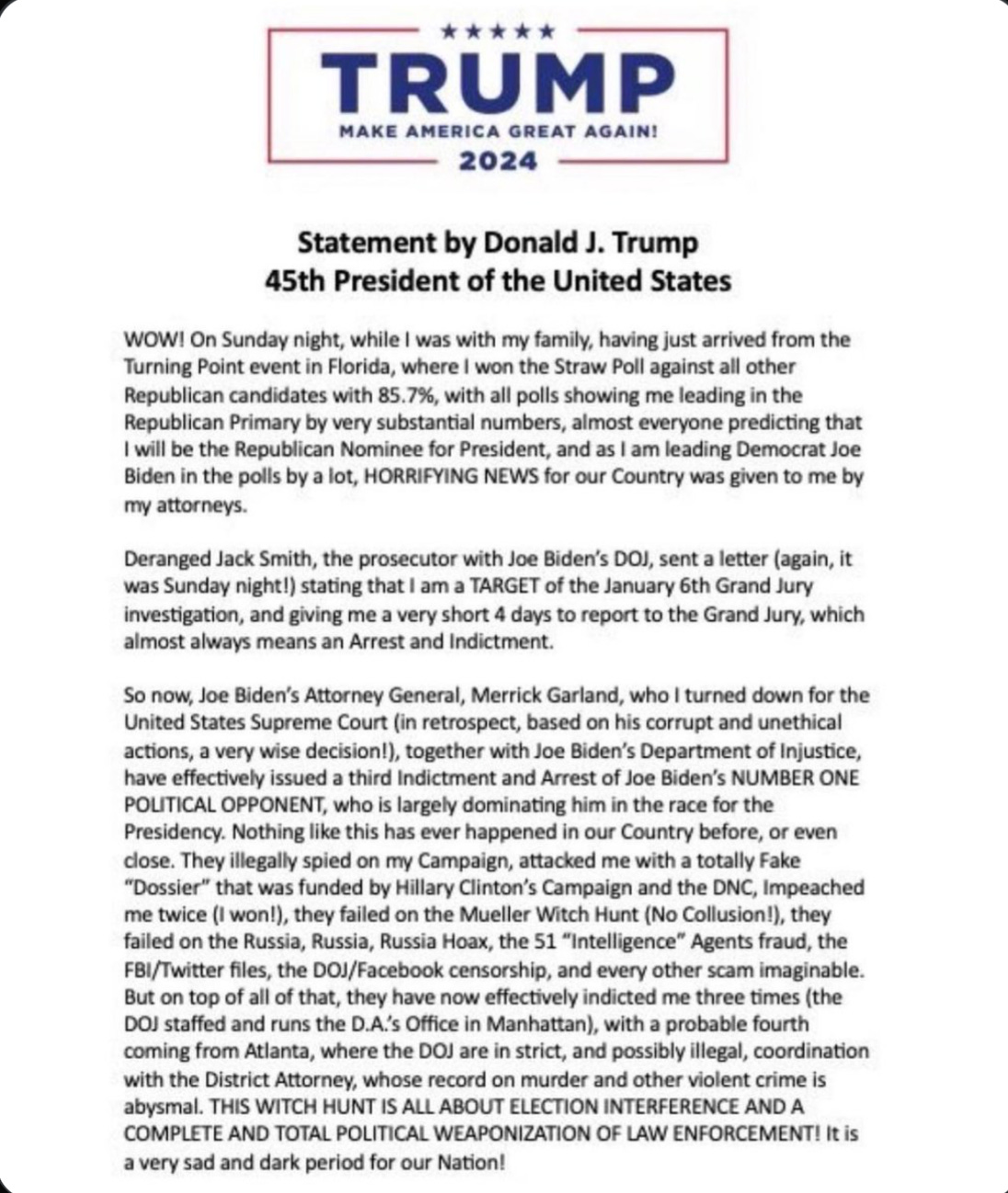 Trump reveals he was sent a letter from Biden’s DOJ’s prosecutor Jack Smith that he is the target of January 6th Grand Jury Investigation. The letter reportedly gives Trump four days to report to the Grand Jury. Trump went on to say that he believes he will be indicted and arrested.