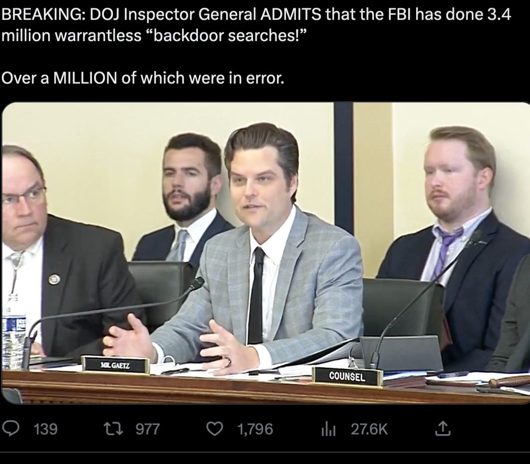 BREAKING: DOJ Inspector General ADMITS that the FBI has done 3.4 million warrantless “backdoor searches!”