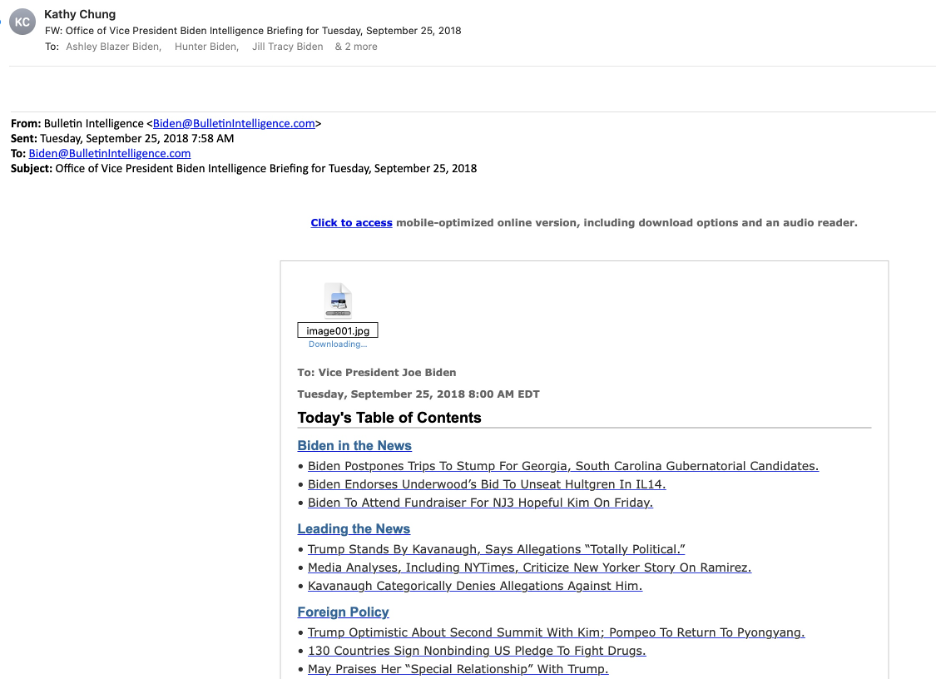 A case in point would be the intelligence briefings shared with Hunter by the Office of the Vice President. Over a period of what appears to be years, a daily intelligence briefing prepared for Joe Biden was forwarded to Hunter and several other members of the Biden family. When this practice began is unclear. The documents reviewed so far appear to have been from the period after Joe left the White House. They were sent by a woman named Kathy Chung.